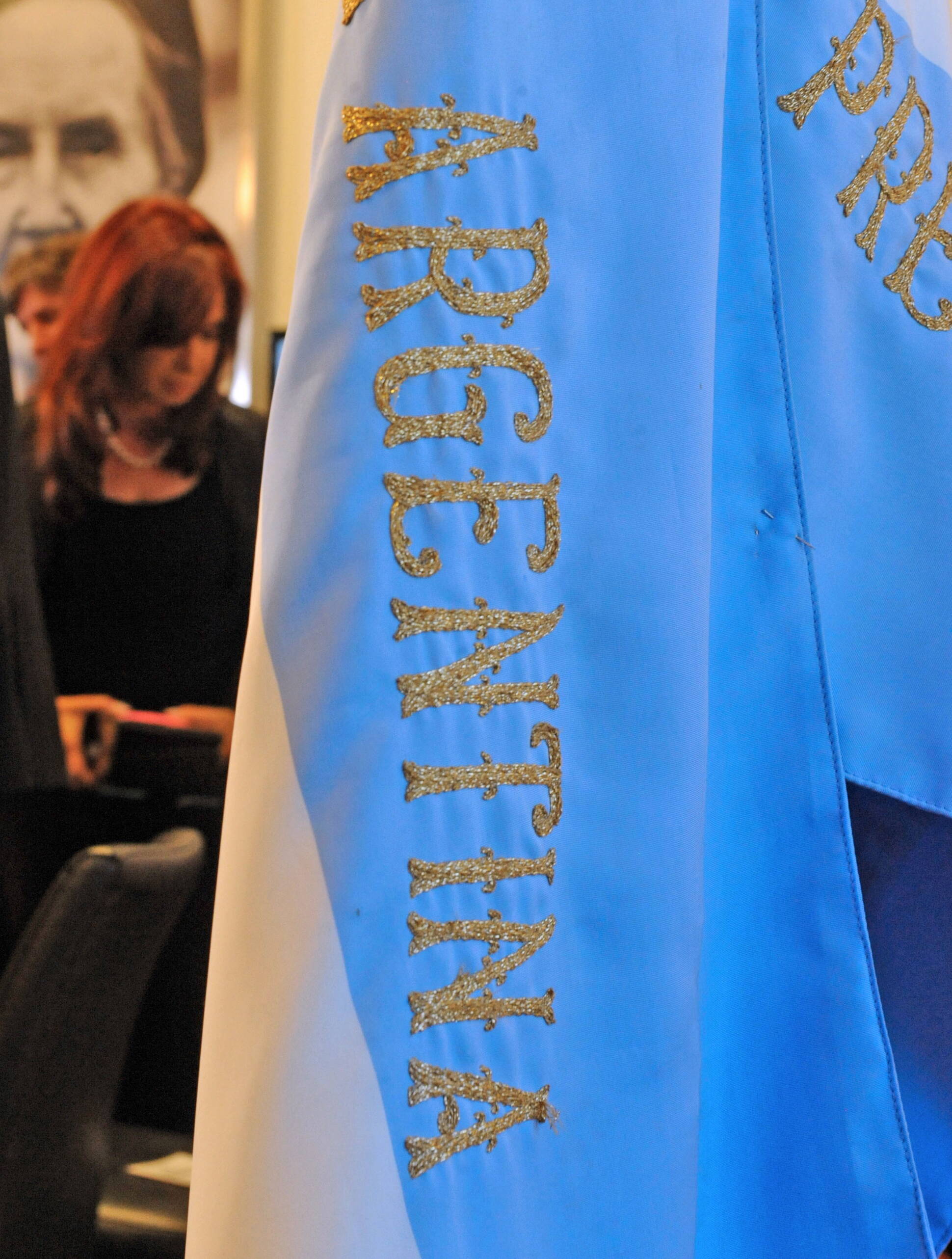 La presidenta Cristina Fernández, detrás de la bandera argentina, en el Salón Mujeres Argentinas del Bicentenario de Casa de Gobierno.