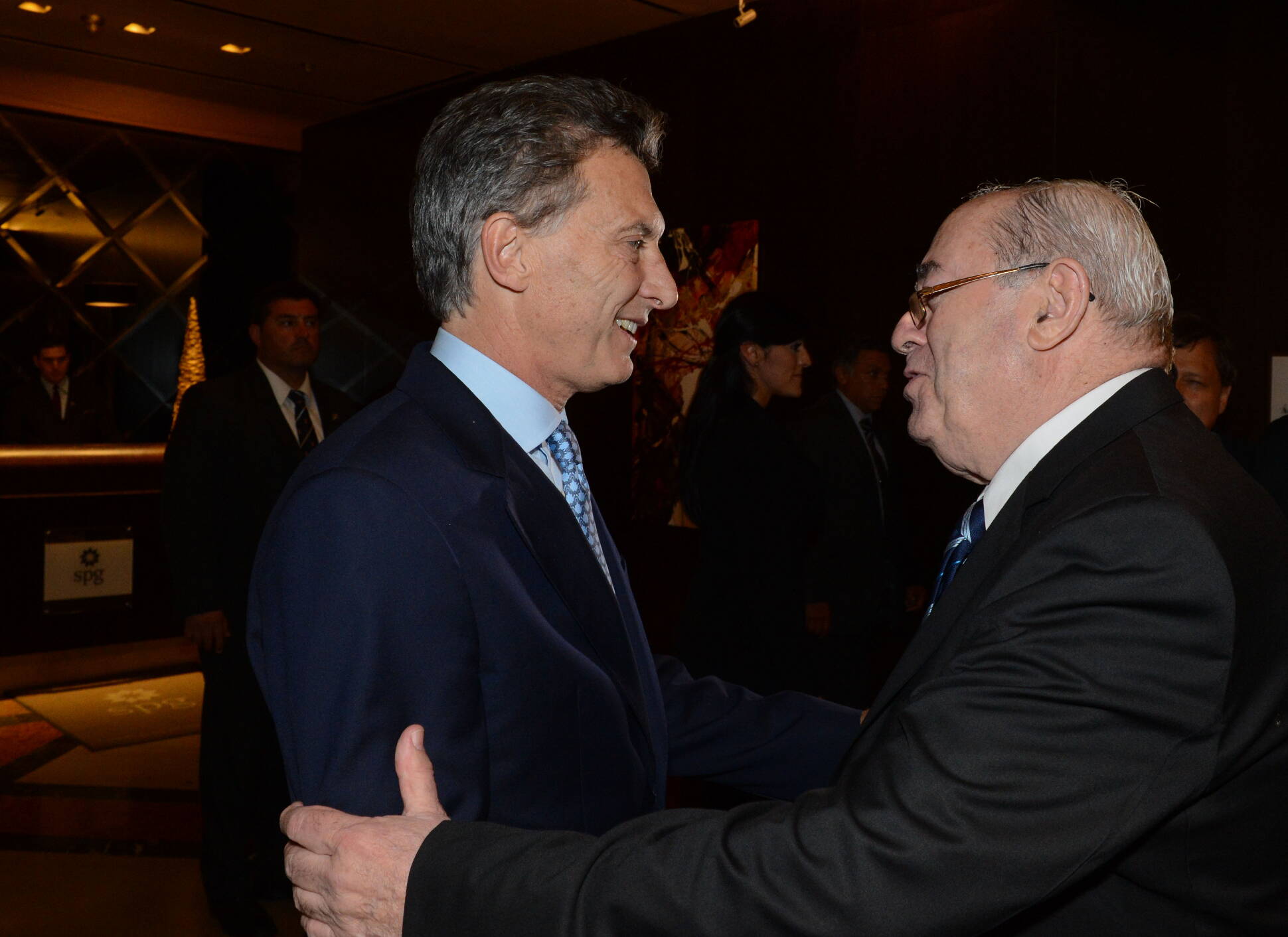 El presidente Mauricio Macri recibe el saludo del titular de ADEPA, Guillermo Ignacio, en la cena anual de la entidad que se realizó en el Libertador ...