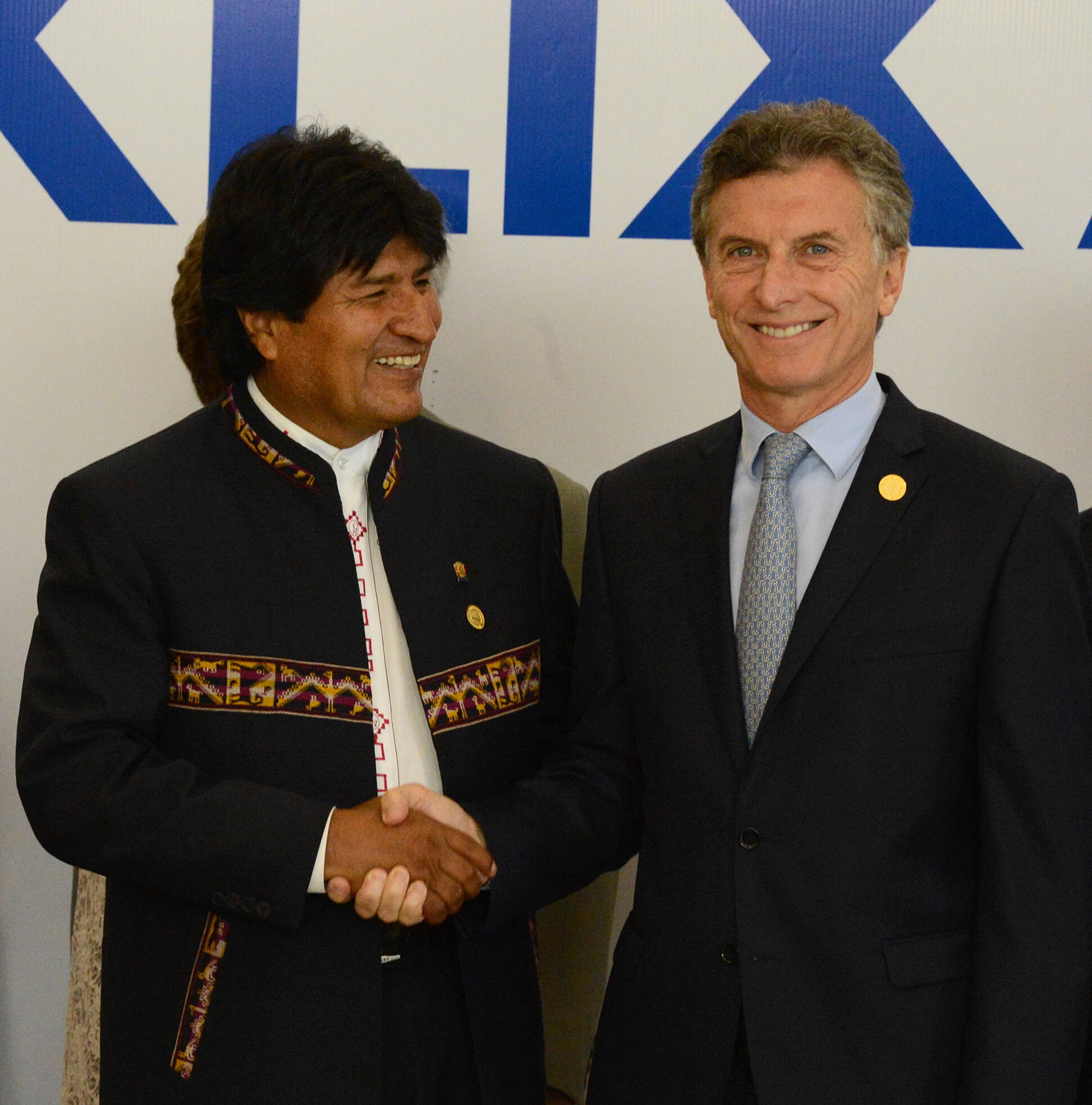 El presidente Mauricio Macri saluda a su par de Bolivia, Evo Morales, en la previa de la foto oficial de la 49° Cumbre del Mercosur, en Paraguay.