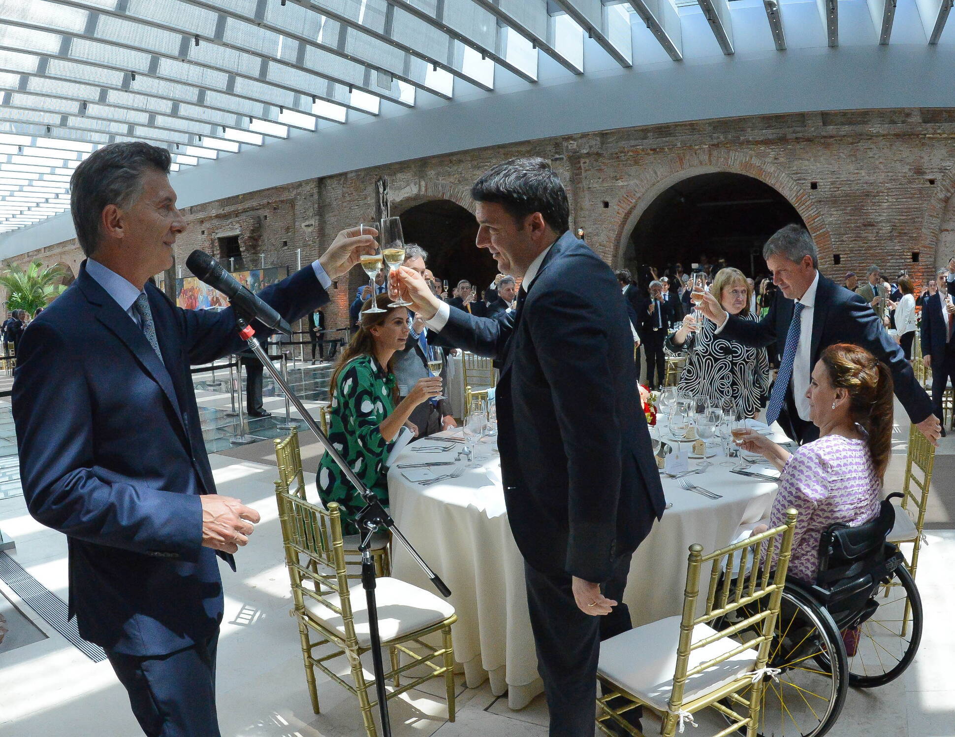 El Presidente Mauricio Macri junto al primer ministro de Italia, Matteo Renzi, brindan en el Museo del Bicentenario.