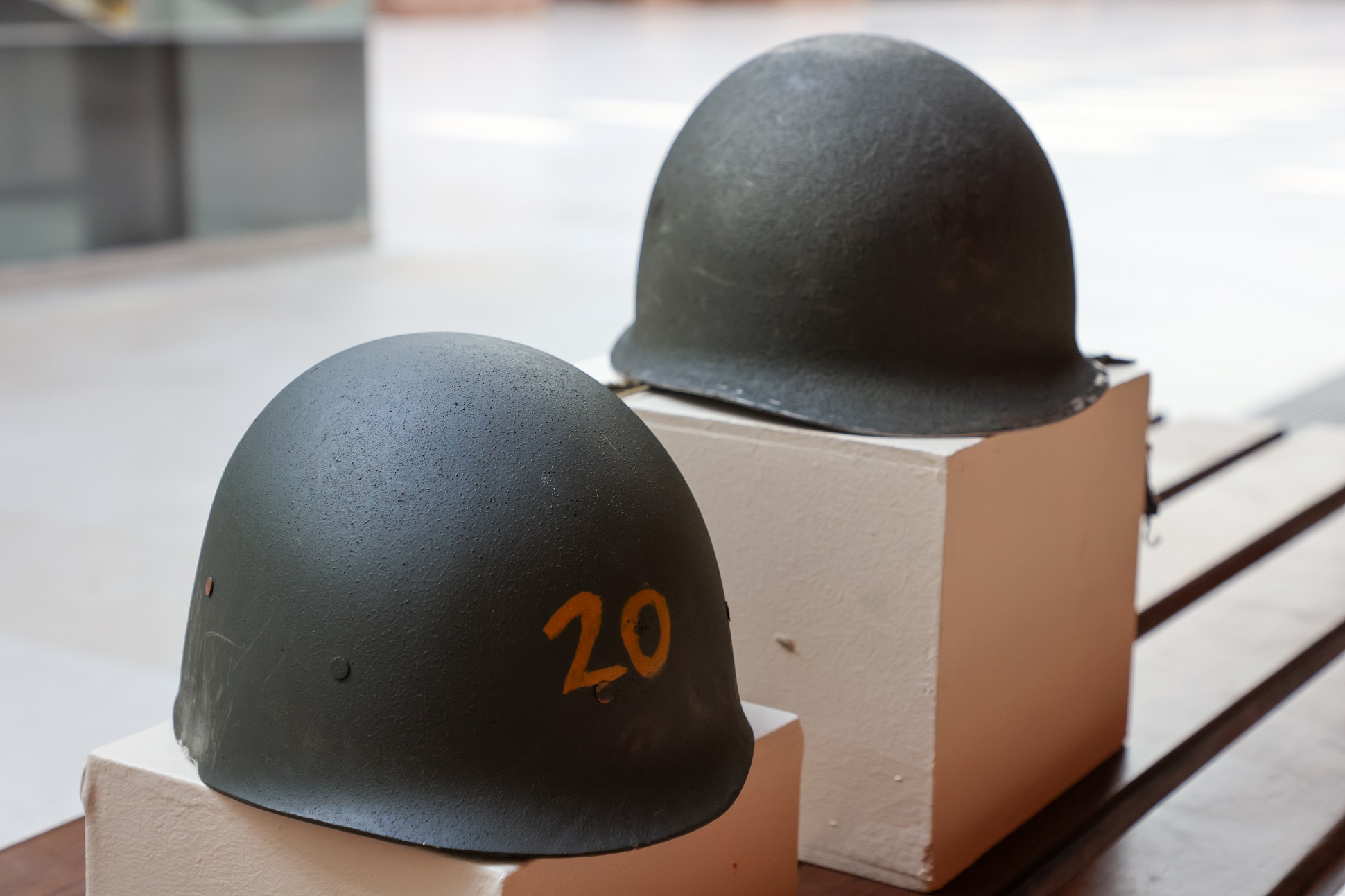 Dos cascos pertenecientes a soldados que participaron en la Guerra de Malvinas. Colección Museo Casa Rosada.